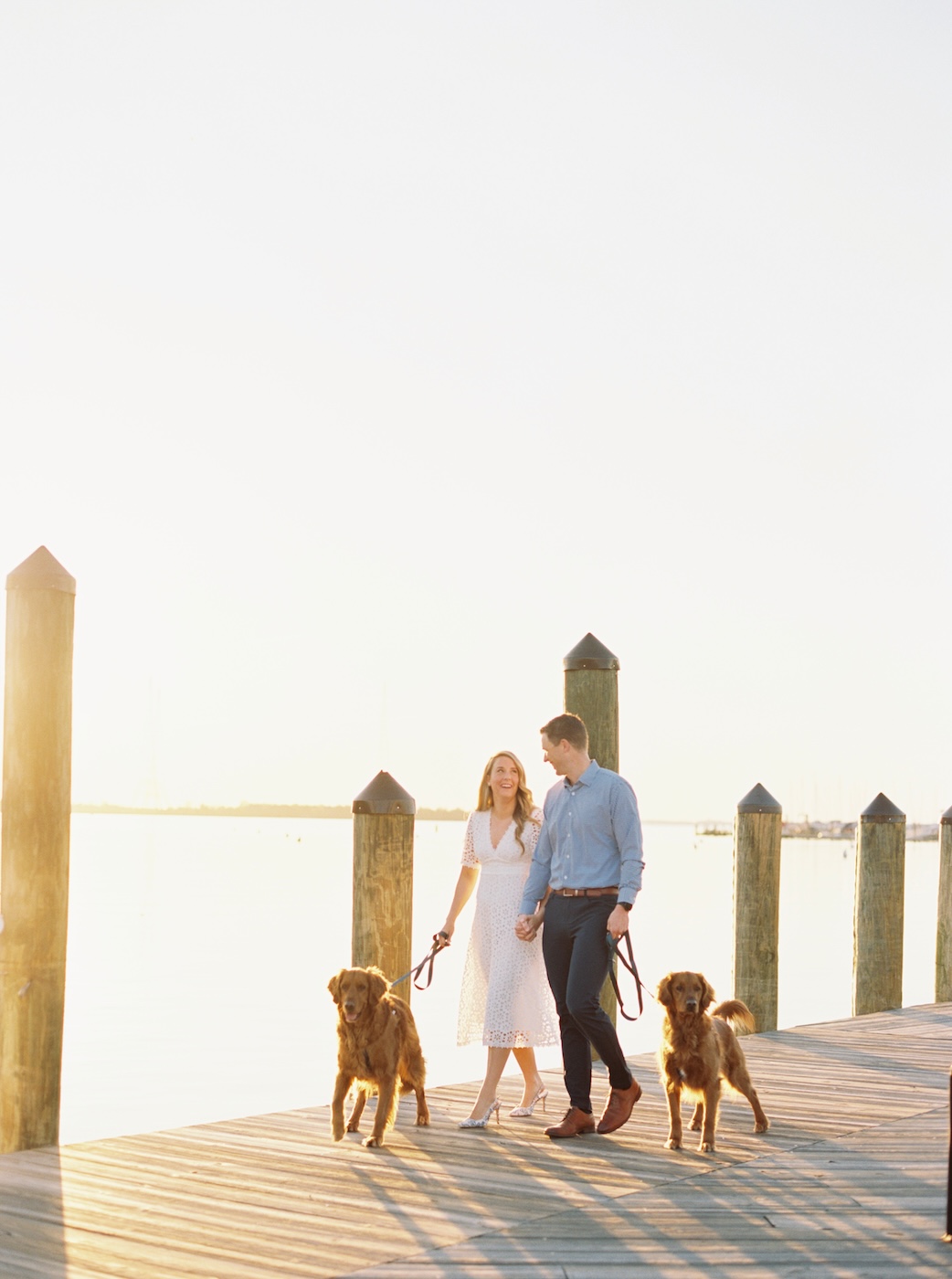 What do you get when you mix golden hour light, waterfront views, two adorable golden retrievers, and a champagne toast? The dreamiest Annapolis engagement session! Colleen and Matt’s shoot was full of love, laughter, and laid-back elegance — complete with dockside cuddles, pup cameos, and a sunset celebration that felt straight out of a rom-com.